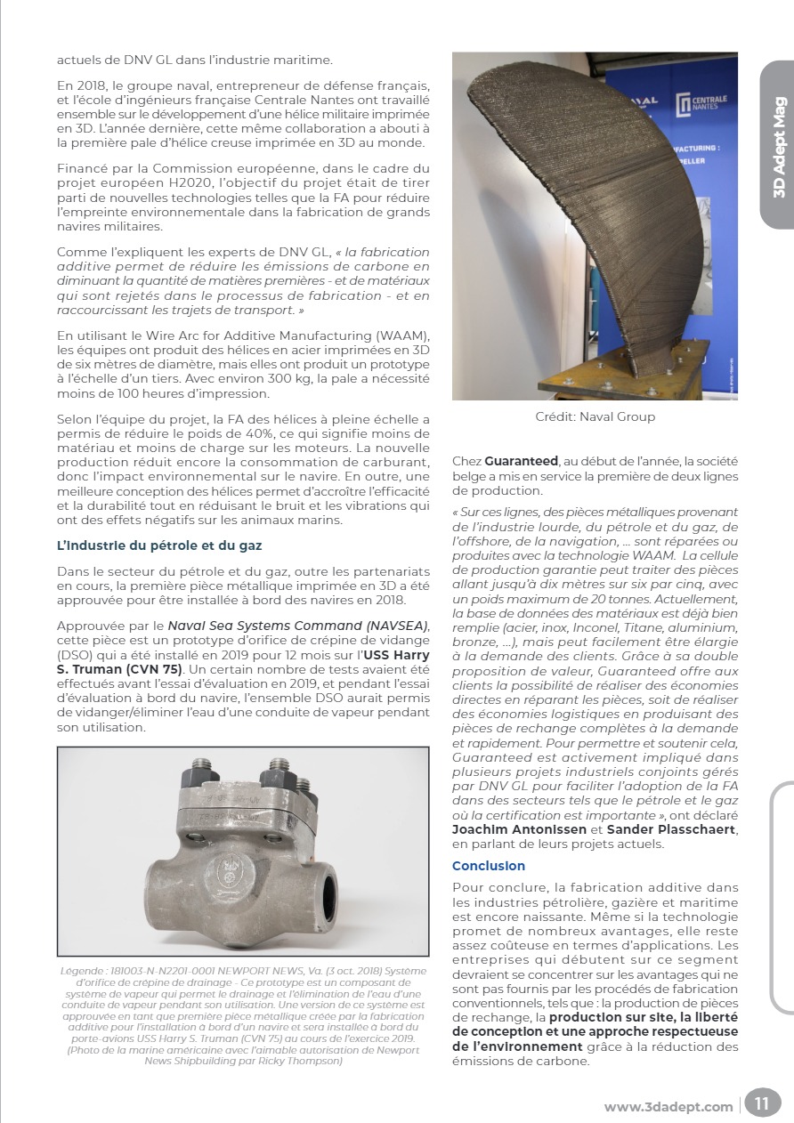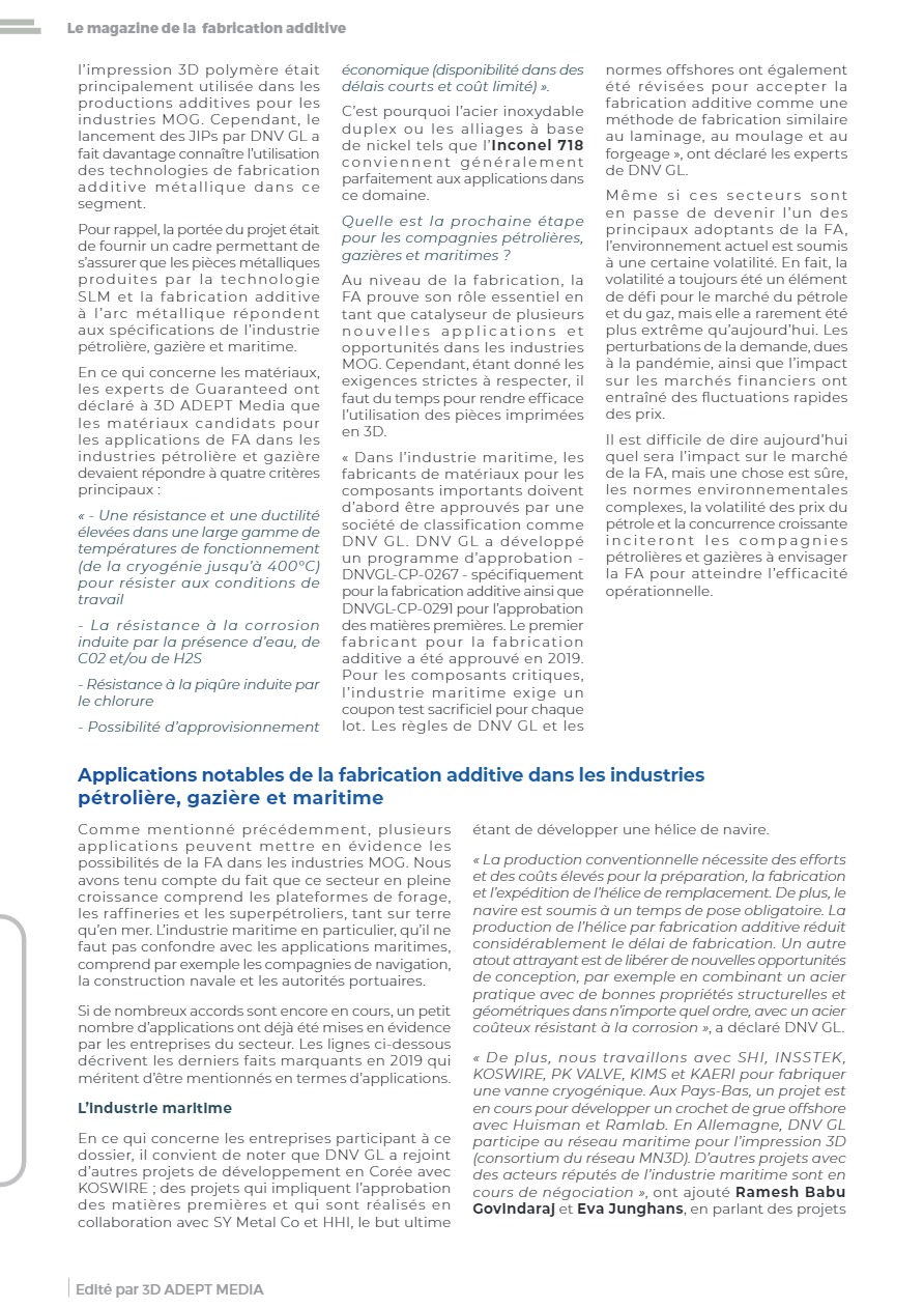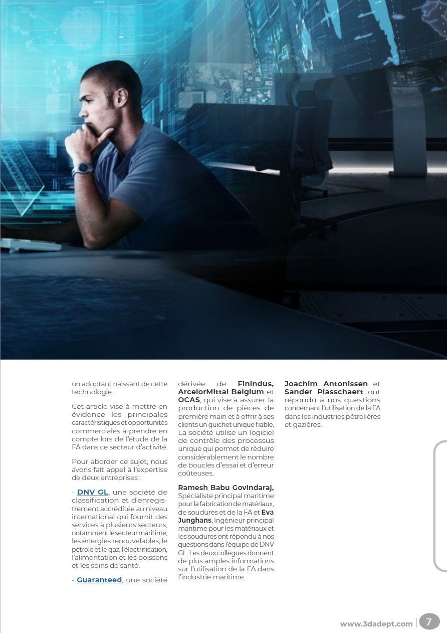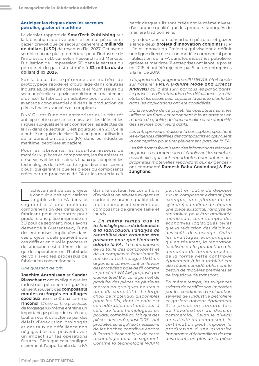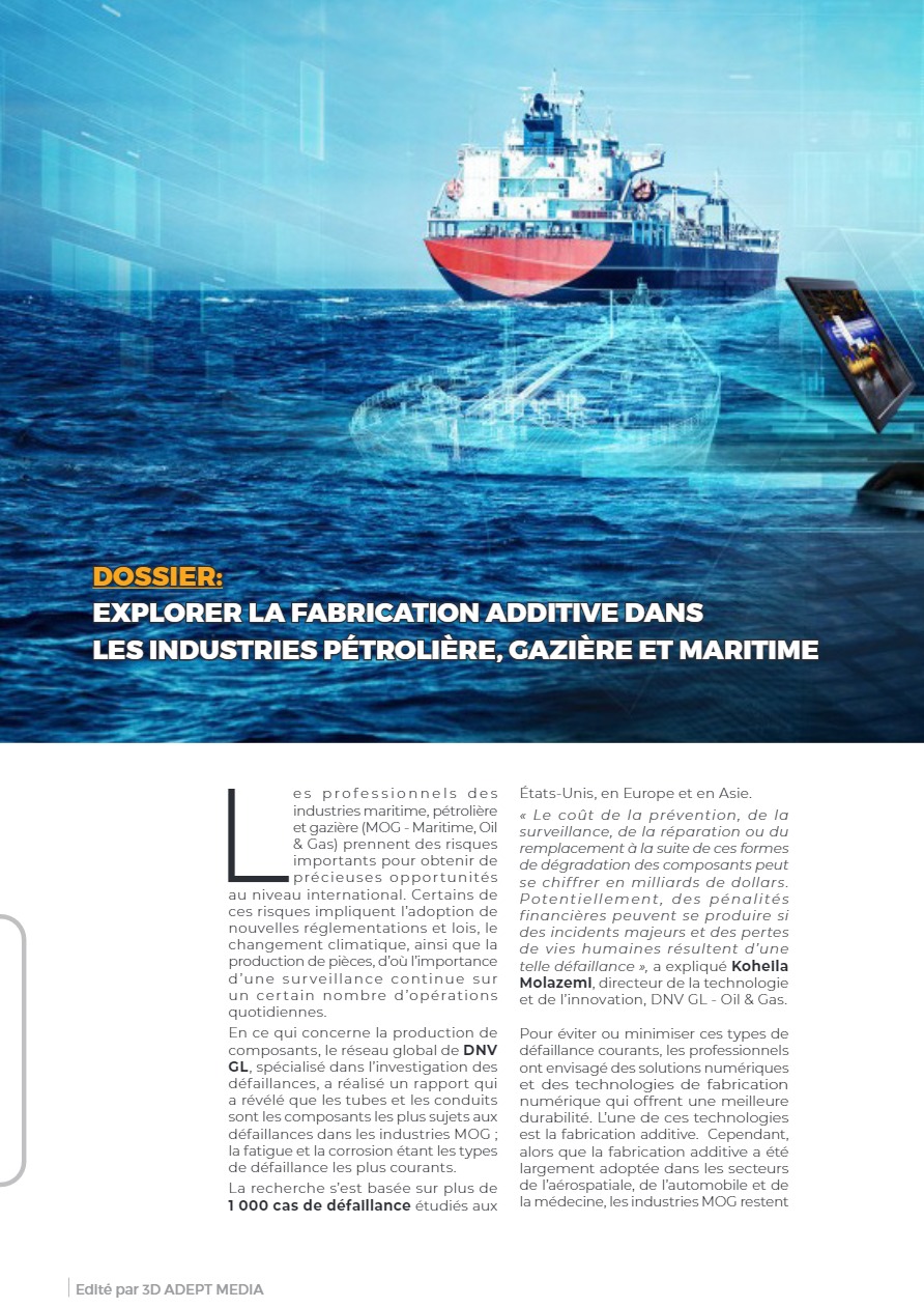 Dans le « Dossier », nous avons étudié l’utilisation de la fabrication additive dans les industries pétrolière, gazière et maritime. Ces industries sont appelées à adopter massivement la FA, mais l’environnement actuel est soumis à une certaine volatilité. DNV GL et Guaranteed ont été invités à partager leur point de vue sur quelques questions.