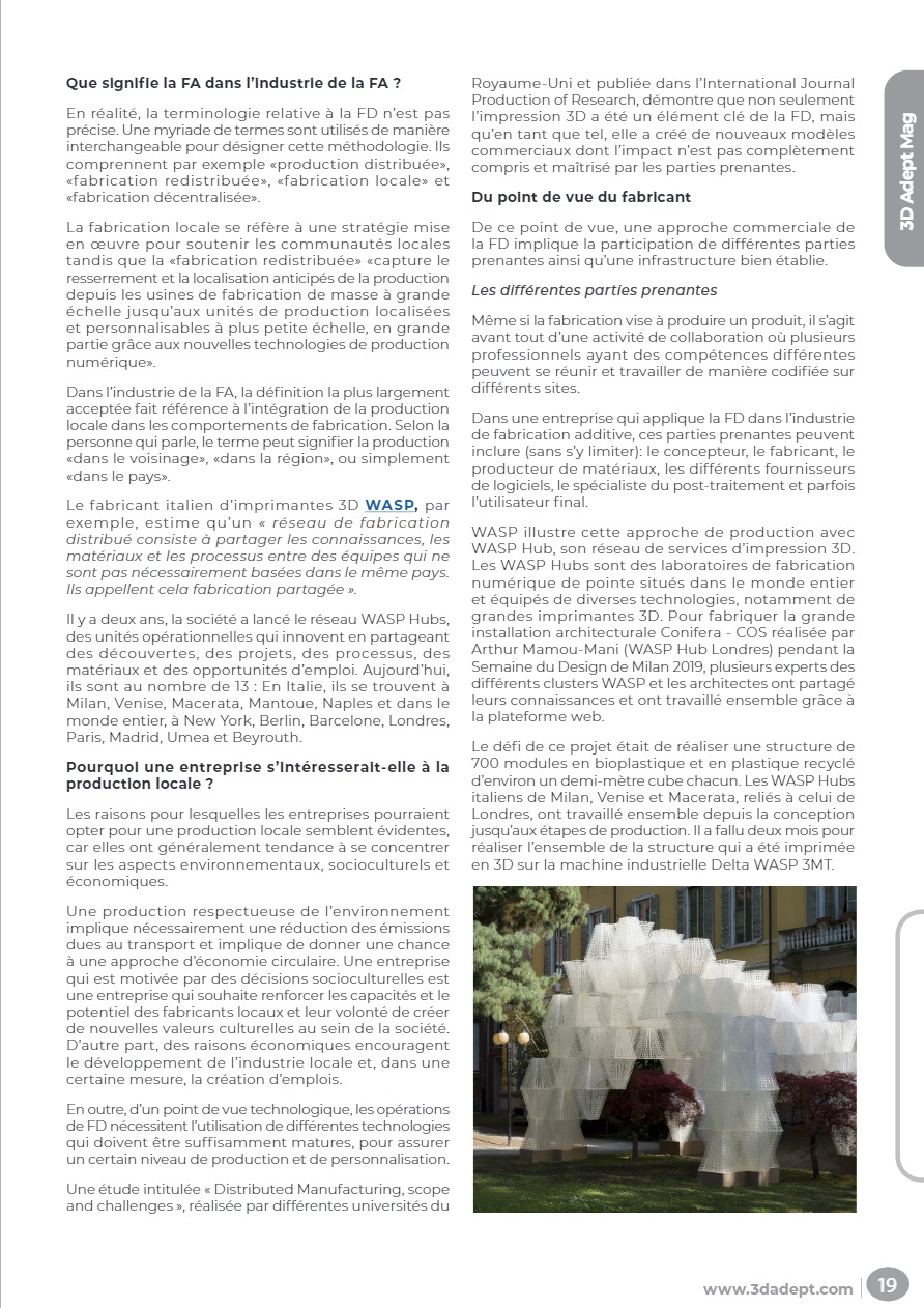 La fabrication distribuée (DM = Distributed Manufacturing) est-elle une forme d’économie partagée dans l’industrie de la FA ? Dans ce segment d’ « Imprimante3D/Logiciels », nous avons réalisé que la DM n’est pas un modèle commercial facile à mettre en œuvre. Les avantages sont bien connus, mais les défis doivent encore être relevés. Le fabricant italien d’imprimantes 3D WASP était notre invité dans ce segment.