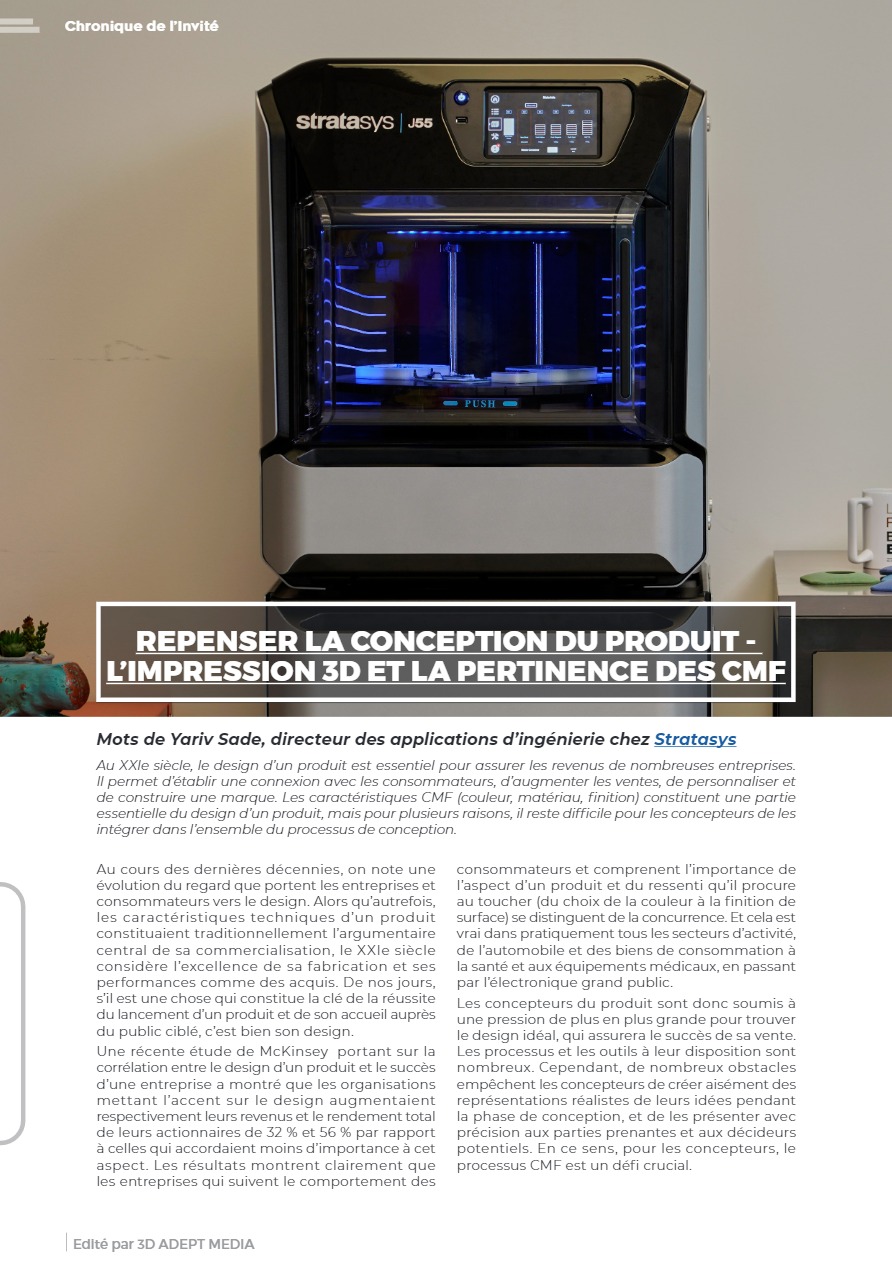 Yariv Sade, directeur de l’ingénierie des applications chez Stratasys, a eu la parole dans la « Chronique de l’invité » pour discuter d’un sujet unique : Réimaginer la conception des produits – l’impression 3D et l’opportunité du CMF.