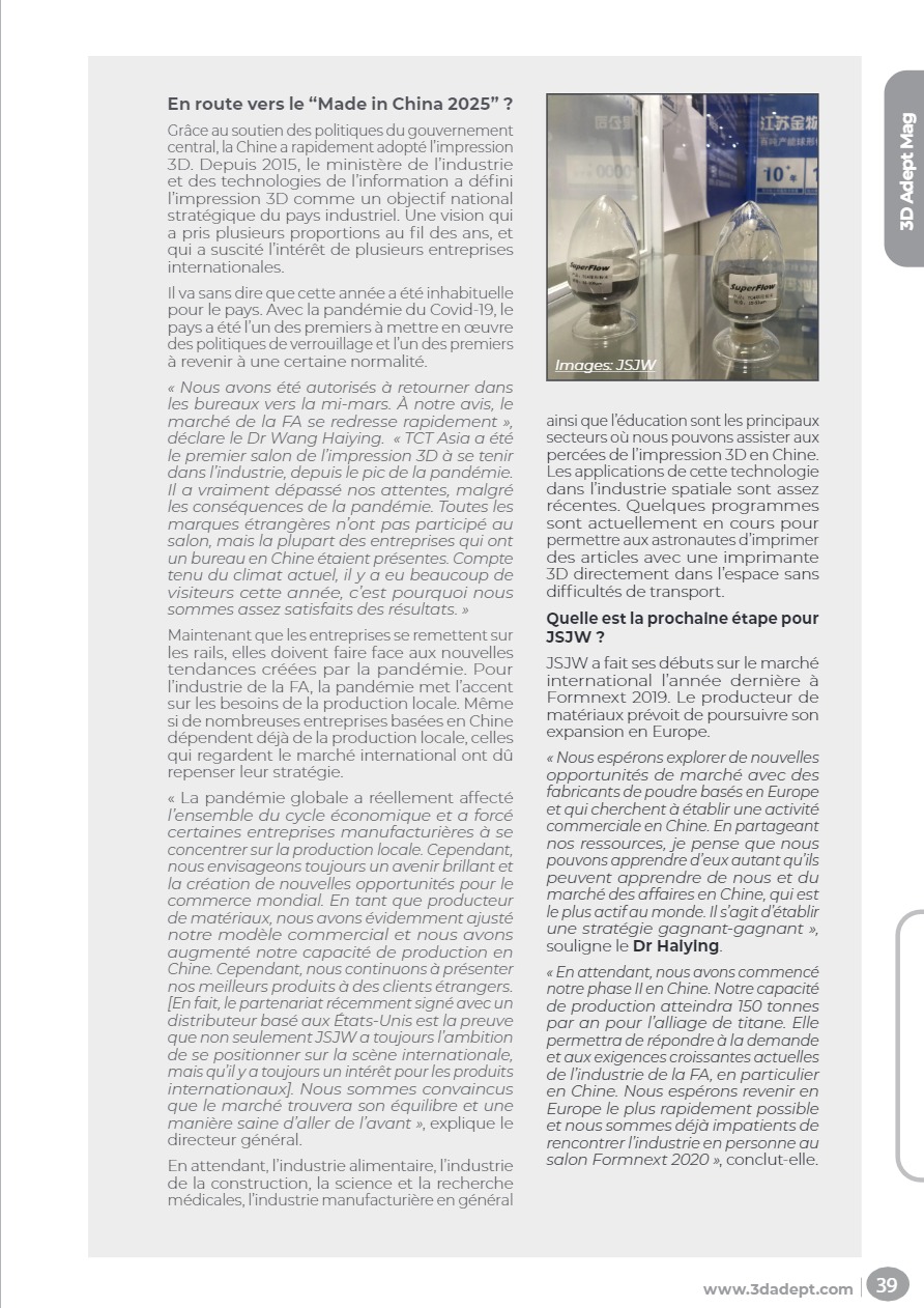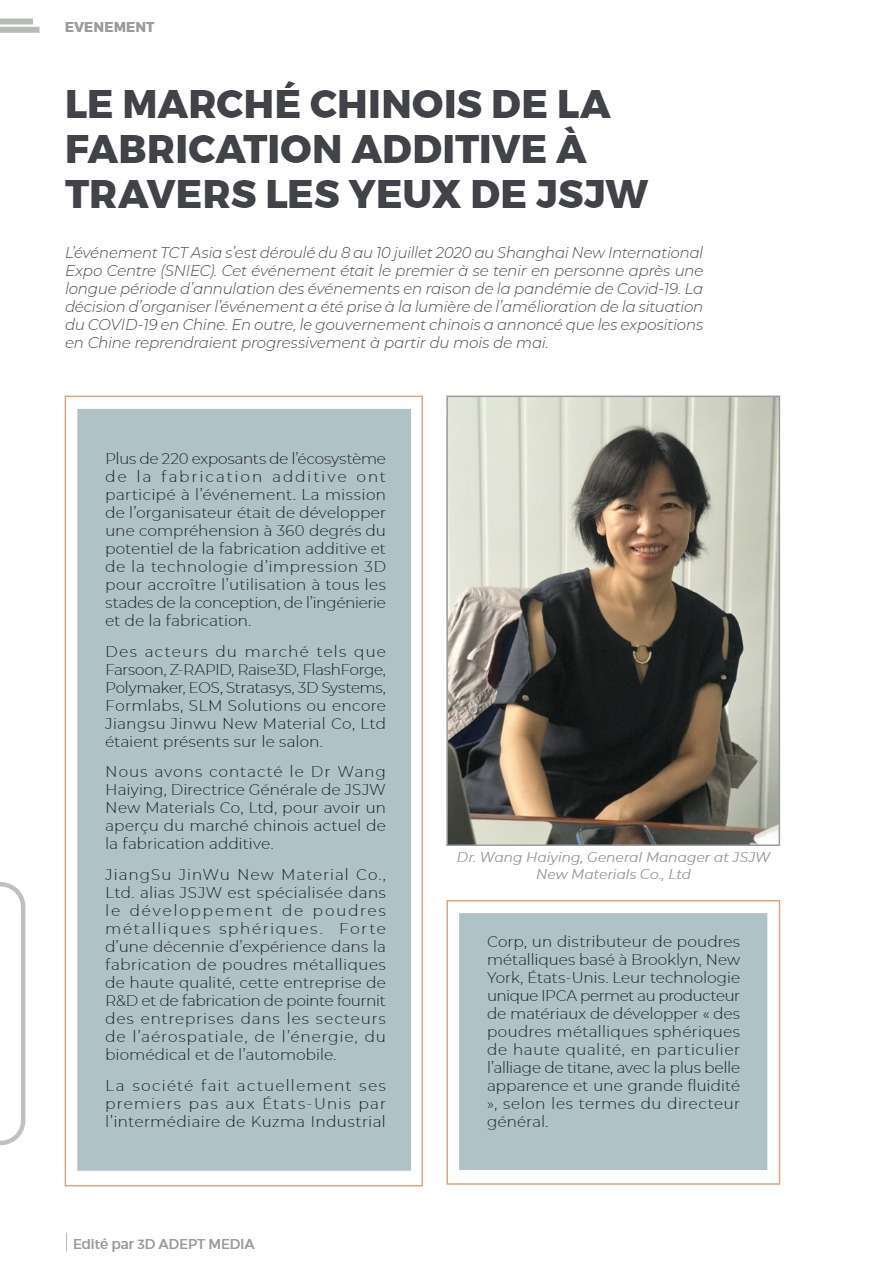 ÉVÉNEMENT : TCT Asia a été le premier événement d’impression 3D/FA à se tenir en personne en Chine après une longue période d’annulation des événements en raison de la pandémie de Covid-19. Ce segment donne un aperçu du marché de la FA en Chine – à travers les yeux de JSJW New Materials Co, Ltd.