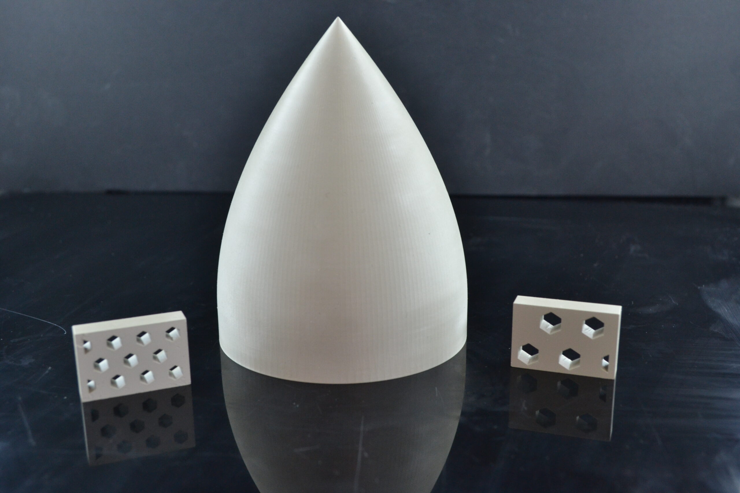 Silicon Nitride (Si₃N₄) is ideal for parts exposed to thermal shocks. Its high mechanical strength, excellent fracture toughness, and wear resistance make it a top candidate for such applications. 3D printing allows the production of lightweight components with integrated features for improved performance, such as mirrors, structural parts, and radomes.