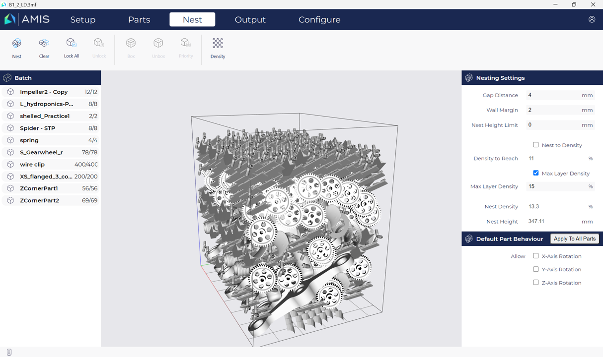 AMIS Runtime automates the complete Build Preparation workflow, from part import to intelligent nesting to slicing and exporting, enabling AM operations to run consistent, configurable, and repeatable procedures across SLS, MJF, Binder and Material Jetting systems.