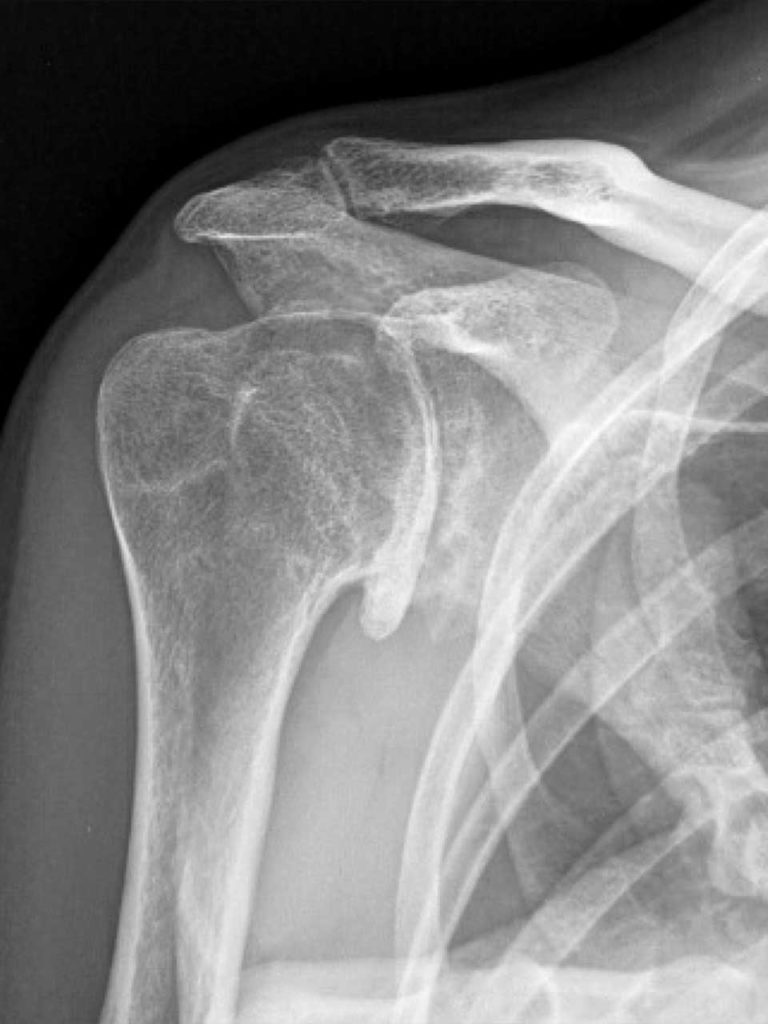 Voici la radiographie post-opératoire montrant l’épaule sans tige et la glène de la cage d’équinoxe, imprimées au laser. Image fournie par le Dr. Stephanie Muh.