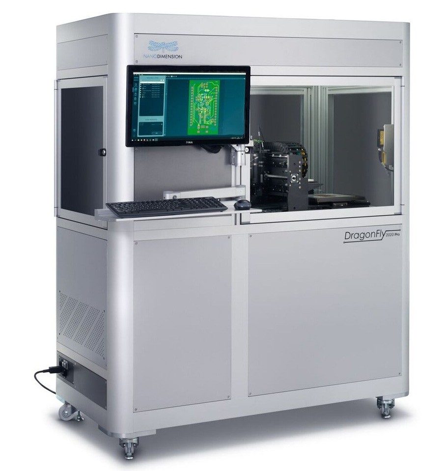 Sortie en 2017, l’imprimante 3D DragonFly 2020 de Nano Dimension produit une impression multicouche de traces conductrices par jet d’encre à une résolution latérale de près de 30 µm. Les experts de l’Université de Duke ont expliqué que cela requiert énormément de temps pour développer de nouvelles encres électroniques pour les procédés à jet d’encre. Ceci est principalement dû à la nécessité d’adapter la tension superficielle et la viscosité (8-12 cp) de l’encre pour obtenir une taille de gouttelettes souhaitée (∼30 µm) et des caractéristiques de jet reproductibles. De plus, « le colmatage peut être un problème si la taille des particules ou la quantité de solides dans l’encre est trop élevée. »