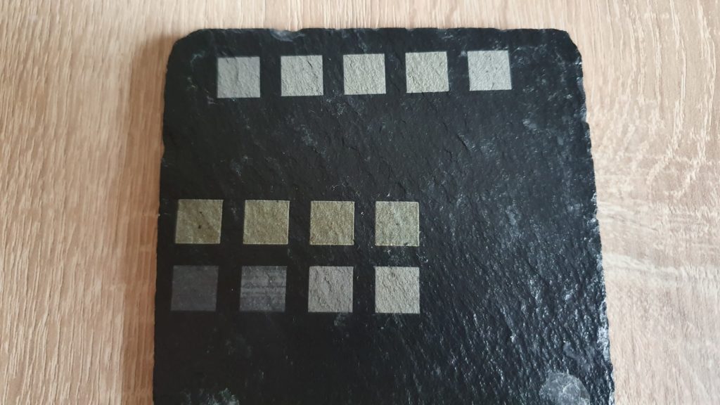 Slate itself is a great material to work with. Several months ago, before I’ve got my 10w Endurance laser, I engraved on slate with my 2.5W Laser. So I started with the same settings as before. Means, running the laser at about 20mm/s and full power. But the first outcome was far away from what I was expecting. As you see in the picture below: