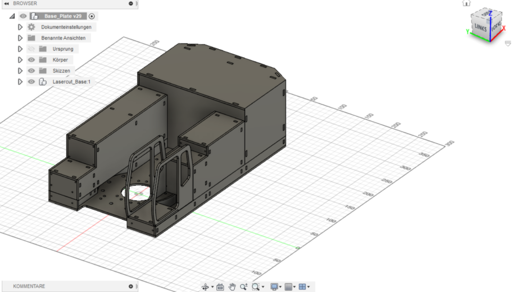 For me it was important that I’m able to cut most of the parts out of 3 mm plywood. I designed it to fit for that and only got some 3D printed parts and of course some screws and electronics. The first prototype was designed to be glued together but I’ve learned the lesson and because of instability I redesigned it for no glue and all screw.